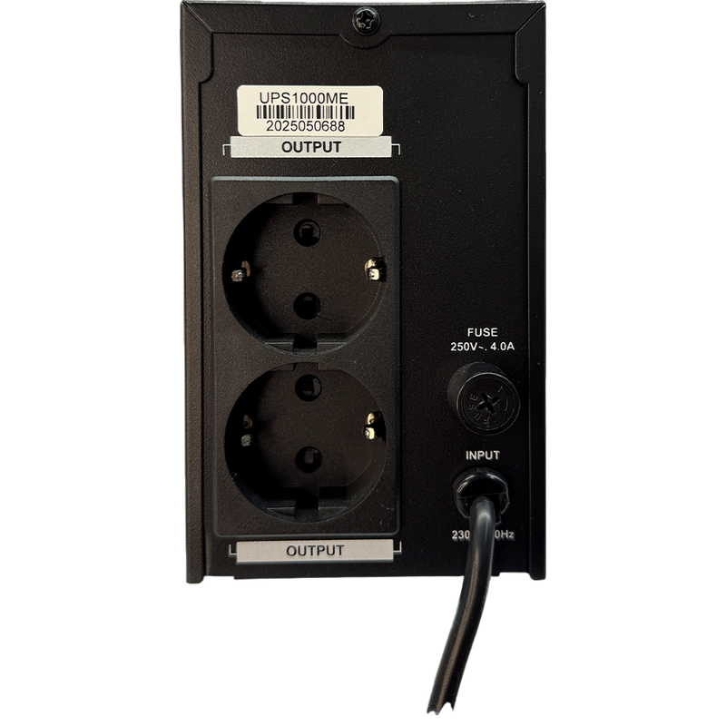 --- UPS1000ME 1000VA/500W Front Panel: LED indicators AVR: 3 steps of AVR, CPU controlled Input voltage range: 145~290Vac±5Vac Input frequency range: 50Hz / 60Hz (Auto sensing) Output voltage range: 200~255Vac Output frequency (DC mode): 50±0.5Hz / 60±0.5Hz Wave form: PWM (DC Mode) Transfer time: Typical 2~6ms, Max.10ms. 2 Germany Sockets Battery: 1 pcs*12V9Ah Charging period: 4~6 hours recover to 90% capacity PROTECTION: 1. Battery low voltage protection 2. Overload protection 3. Short circuit protection FUNCTION: 1. Auto re-starts when AC recovers 2. Silence setup 3. Automatic charging (offline charging) Unit dimension (mm): 300*95*140mm Net weight (kg): 4.8kg