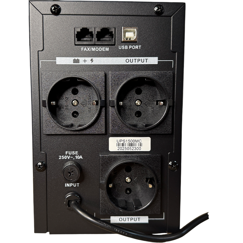 --- UPS1200ME 1200VA/720W Front Panel: LED indicators AVR: 3 steps of AVR, CPU controlled Input voltage range: 145~290Vac±5Vac Input frequency range: 50Hz / 60Hz (Auto sensing) Output voltage range: 200~255Vac Output frequency (DC mode): 50±0.5Hz / 60±0.5Hz Wave form: PWM (DC Mode) Transfer time: Typical 2~6ms, Max.10ms. 3 Germany Sockets Battery: 2 pcs*12V7.5Ah Charging period: 4~6 hours recover to 90% capacity PROTECTION: 1. Battery low voltage protection 2. Overload protection 3. Short circuit protection FUNCTION: 1. Auto re-starts when AC recovers 2. Silence setup 3. Automatic charging (offline charging) Unit dimension (mm): 330*122*192mm Net weight (kg): 9.5kg