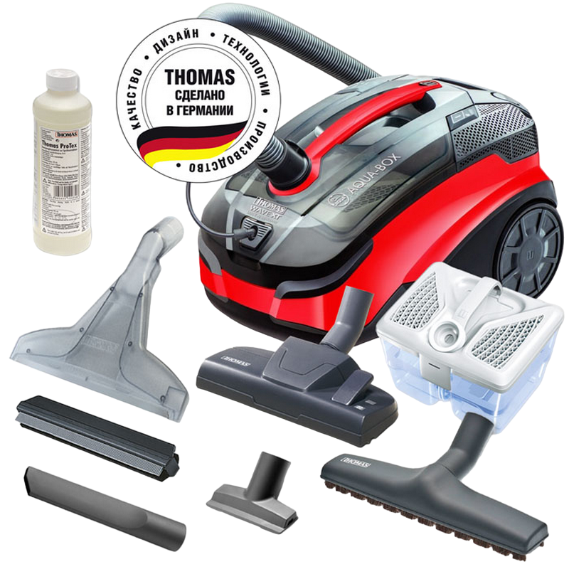 , 1600W Power output, 320W suction power, 1,8l capacity, Normal/Carpet brush, crevice nozzle, wet nozzle, furniture brush, turbo and parquete brush, black red