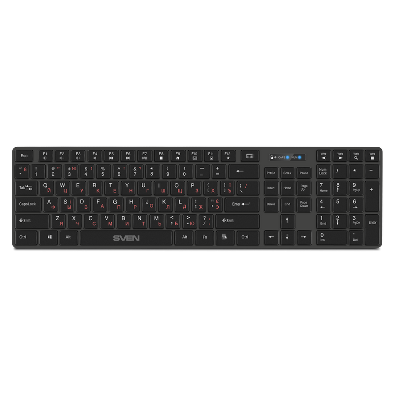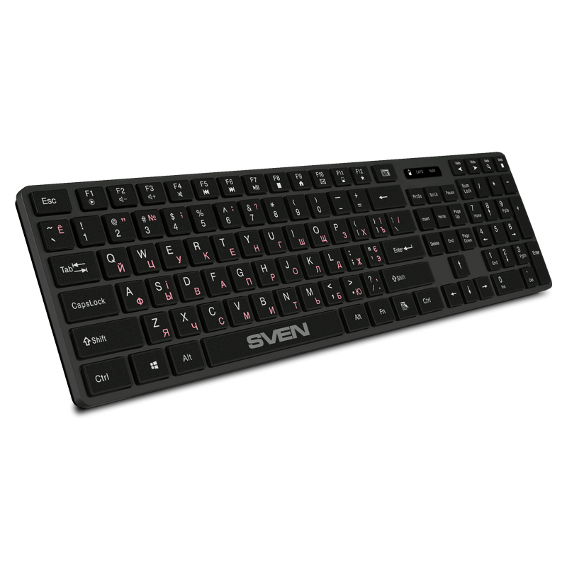 . Typе standard Communication technology wireless OS compatibility Windows Keyboard layout Rus/Ukr/Eng Cyrillic alphabet layout Windows Number of keys, pcs 109 Number of shortcut keys, pcs 12 Interfacе USB Keys contact membrane Battery type 2 × AAA Durability, clicks more than 20,000,000 Conformity to standards FCC, CE, EAC Dimensions (W × H × D), mm 430 × 30 × 118 Weight, g 413 Color black