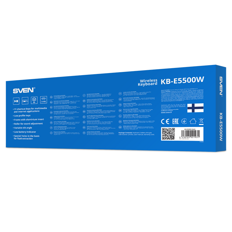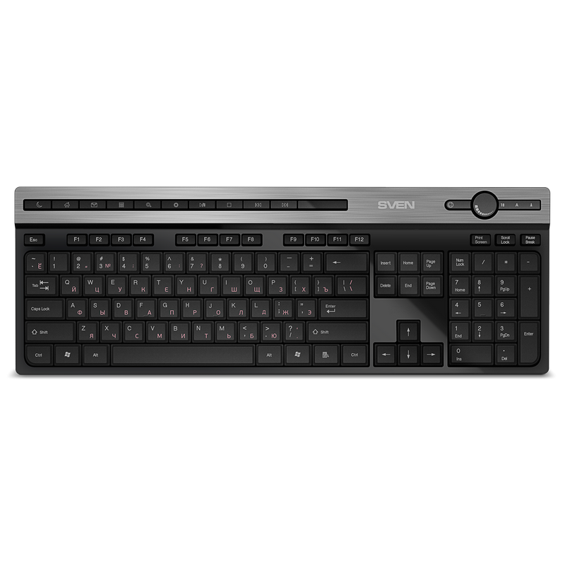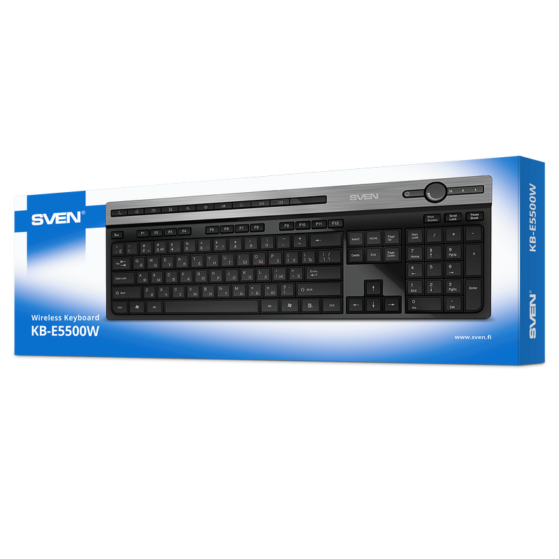 Wireless Keyboard SVEN KB-E5500W, Multimedia, Splash proof, Volume knob, Aluminum insert, Battery indicator, 1xAA, 2.4GHz, EN/RU, Black/Silver