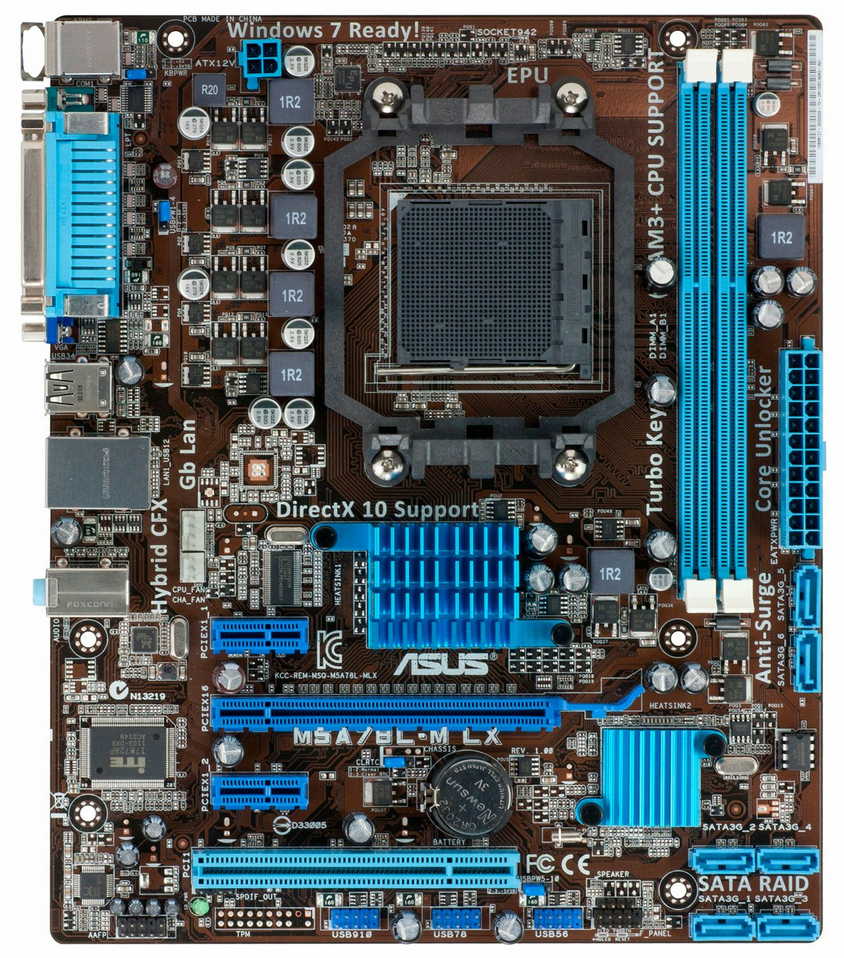 ASUS M5A78L-M LX3, Socket AM3+/AM3, AMD 760G/SB710, FSB up to 5200, HT3.0, Dual 2xDDR3-1866, VGA Radeon HD3000, 1xPCIe X16, 4xSATA2, RAID, 1x COM, ALC887 7.1ch HDA, GigaBit LAN, mATX