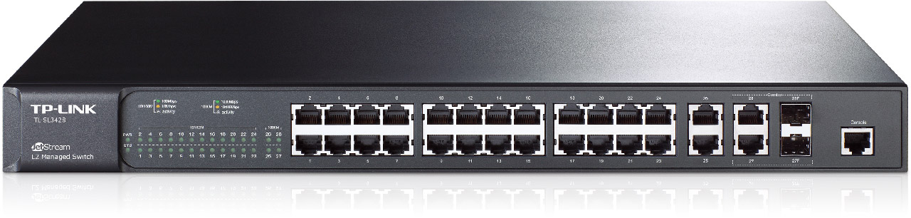 TP-Link TL-SL3428, ManagedSwitch 24+4G Gigabit-Uplink, 24-ports 10/100Mbit, 2-ports 10/100/1000Mbit, 2 SFP expansion slots supporting MiniGBIC modules