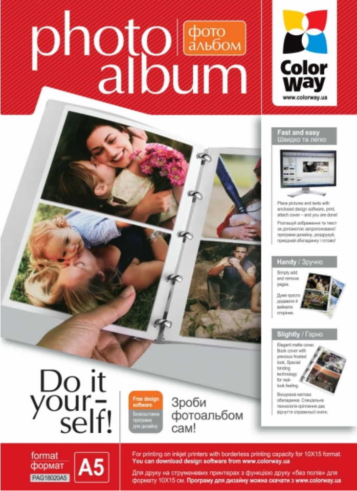 Фотоальбом ColorWay - это набор, в состав которого входит фотобумага ColorWay, обложка и соединительные скобы. Удобный размер бумаги и полностью адаптированная программа для дизайна позволяют легко и быстро создать персональный альбом с фотографиями размером от А5 до 10х15. Отличный подарок для родных и близких! На нашем сайте вы можете скачать бесплатную программу: вес - 3 Мб, не требует инсталляции. Подробная инструкция поставляется в наборе. Предназначено для печати на струйных принтерах. Название: Фотоальбом CW "DIY" глянцевый, 180г/м, 20л, 2хА5 Формат: A4 Тип: Глянцевая Вес ISO536 (гр/м2 ±5): 180 Колличество листов в пачке: 20 Разрешение (dpi): 5760 Белизна DIN53145-2 (?±5): 115 Толщина ISO534 (?m ±10): 215 Яркость ISO9001 (% ±2.0): 97 Прозрачность ISO2471 (% ±4): 92 Влагостойкость: да Глянцевое соотношение ISO8254-1 (75° +5): 75 Гладкость ISO5627 (s): >75 Ламинация холодная & горячая: да Пигментные чернила: да Водорастворимые чернила: да Светостойкость (лет): 20