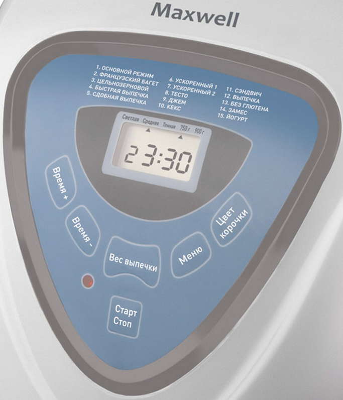 Выбор цвета корочки: 3 варианта / Антипригарное покрытие формы для выпечки / В комплекте мерная ложечка и стакан / Нескользящие прорезиненные ножки *Технические характеристики* Количество программ выпечки: 15 Мощность: 600 Вт Максимальный вес выпечки: 900 г Запас памяти при сбое электропитания: 10 мин Число тестомешателей: 1 Поддержание температуры: до 1 ч, есть Программы: Замес теста, Бездрожжевая выпечка, Сладкая выпечка, Ускоренная выпечка, Хлеб из муки грубого помола, Кекс, Пшеничный хлеб, Варенье, Безглютеновая выпечка, Французский багет Таймер: до 13 ч, есть Форма выпечки: буханка Материал корпуса: пластик