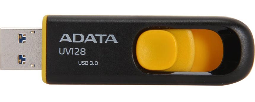 Флешка ADATA, DashDrive UV128, 16Gb, USB 3.0, black-yellow (Read-90MB/s, Write-40MB/s), Retractable флэш-накопитель 16 ГБ интерфейс USB 3.0 выдвижной разъем скорость чтения/записи: 90/40 МБ/с