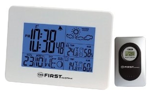 Часы FIRST 002461 — Диапазон относительной влажности в помещении / на улице: 20-99% — Диапазон температур в помещении: 0-50 °C — Диапазон температур снаружи: от ?20 до +60 °C — Отображение °C / °F — Функция оповещения наружной температуры — Наружный Гигро-термометр (максимум 3 беспроводных датчика — 433 МГц) Тип метеостанция Отображение информации дисплей Функции часы, термометр Дополнительно прогноз погоды, сохранение температурных значений, часы, будильник, обычный календарь, лунный календарь Производитель First