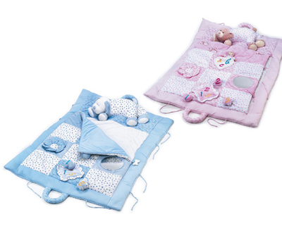 **Спальный и игровой мешок 2 в 1** - можно использовать как мягкий коврик для игры и как матрасик и одеяло для сна. **В комплекте:** мягкие игрушки, зеркальце **Размер:** 100*133 см