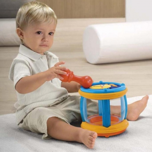 Одна сторона** игрушки «Музыкальный бубен» **представляет собой электронный барабан, на котором можно как руками, так и с помощью молоточка играть веселые мелодии, выбивать веселые звуки, и, конечно же – барабанную дробь. На противоположной стороне игрушки есть специальные отверстия, в которые можно бросать соответствующие разноцветные формочки. Затем достаточно снять крышку, собрать формочки и снова начать игру. Кроме того, барабан можно катать, тем самым, воодушевляя малыша ползти следом.