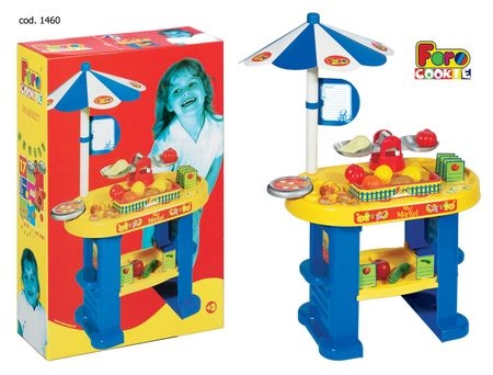 В **игровом наборе "Минимаркет" **имеется все, что нужно для игры в магазин. Сборный из 5 крупных деталей киоск, на двух широких устойчивых ножках. Столик высотой 35 см, размер столешницы: 45х27 см. На столе стоят весы с двумя чашами (длина – 27 см, высота 8 см), с помощью которых можно взвесить овощи и фрукты (лимон, салат, огурец, помидор, картофель, яблоко, сладкий перец, мандарин), для денег имеется коробочка с крышкой. В столике имеются углубления для мелочей, под столешницей есть еще и просторная полка, для хранения овощей и сопутствующих атрибутов торговли - ценников и игрушечных денег. Сбоку на столе закреплен зонтик от солнца. На ножке зонтика закреплена карточка для записей. Для каждого овоща есть свой ценник. Набор «Минимаркет» упакован в картонную коробку 47х29х70. **В комплекте:** Столик с зонтиком, весы с чашами, 9 овощей и фруктов (лимон, салат, огурец, помидор, картофель, яблоко, сладкий перец, мандарин), 6 ценников, 8 монет - евро разного достоинства, наклейки. Возраст: от 3-х лет