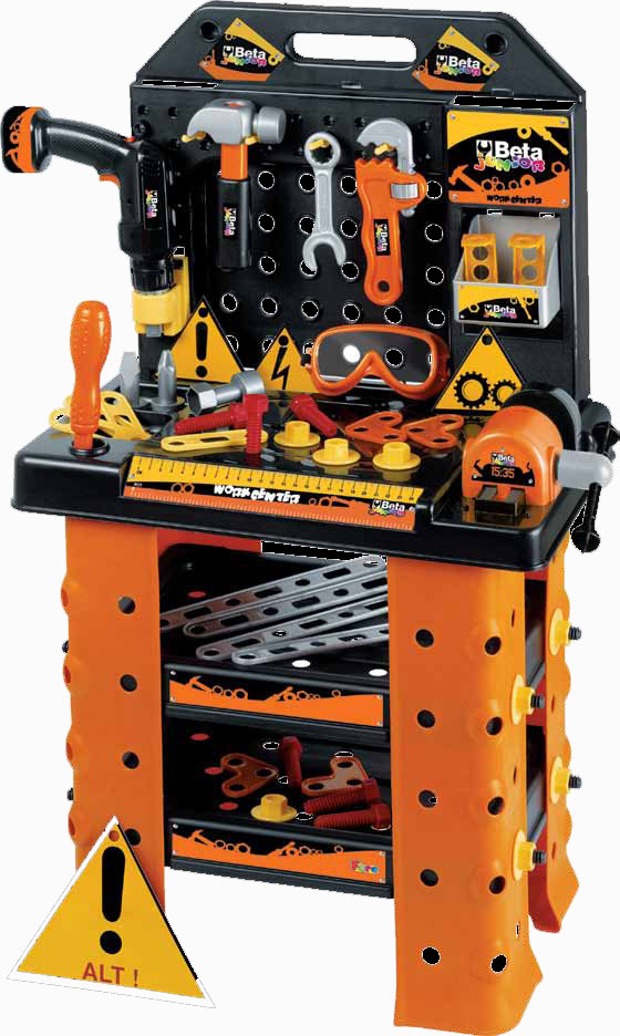 **Игровой набор - Мастерская "Бета"** - это прекрасная сюжетно-ролевая игра, которая знакомит ребёнка с элементами домашнего хозяйства. У него вырабатывается ловкость и слаженность движений рук, сноровка и координация, развивается крупная и мелкая моторика рук. Элементы игры вырабатывают у малыша самостоятельность, ответственность. Набор очень интересен и прост в применении. Для всех принадлежностей предусмотрены свои места. Они удобно и аккуратно размещаются на полочках и в специальных отверстиях-креплениях. Всё под рукой! Ребенку в игровой форме можно привить любовь к порядку. Игра положительно влияет на психологическое и эмоциональное развитие Вашего ребёнка. Теперь Ваш мальчик сможет проявить свою самостоятельность и независимость. Будет ощущать себя взрослым, безопасно "забивая" гвоздь, "сверля" стену. Инструменты как настоящие! Дрель жужжит и сверло вертится. Теперь у папы и дедушки есть своя дрель, а у малыша - своя! **В наборе** 39 аксессуаров для строительства и ремонта:- электрическая дрель;- тиски;- ножовка;- отвертка;- рулетка и многие другие необходимые мелочи для настоящей мужской работы. **Возраст:** от 3-х лет.