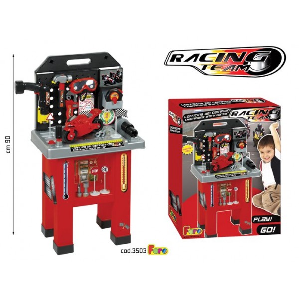 **Игра "Рабочий центр" Гоночная команда" **- это настоящая стильная и красочная мастерская для вашего малыша. Здесь все необходимые инструменты для ремонта и строительства: - электрическая дрель-шуруповерт с насадками; -разводной ключ; - молоток с гвоздодером; - рулетка длиной 95 см; - отвертка с насадками; - гайки и болты; - защитные очки. Все инструменты в мастерской размещены на специальных полочках, крючках, мелкие детали в коробочках и лотках. Дрель имитирует звук настоящего инструмента, а также при переключении кнопки работает на закручивание и раскручивание гаек. С помощью инструментов малыш сам сможет собрать себе гоночный мотоцикл и поиграть в «Формулу-1». Для игры в комплекте идут дорожные знаки. **Материал:** высококачественная пластик. **Размер мастерской:** 670 х 300 х 900 (h) мм
