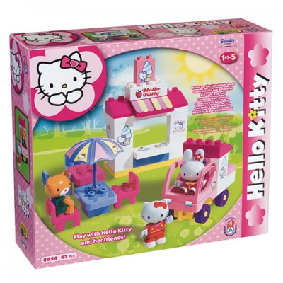 **Конструктор "Hello Kitty" - "Машина с мороженым" - 54 детали** ''Hello Kitty'' - это любимые игрушки для детей во всем мире! Представленный конструктор под названием ''Машина с мороженым'' - отличный подарок для девочки на любой праздник. Яркие цвета, качество и долговечность очень нравятся как детям, так и родителям. В наборе каждый покупатель найдет три фигурки, детали для строительства кафе, четыре стула, два стола, зонтик от солнца, сборная машина. **Размер:** 29,5*22*6 см **Возраст:** 1,5 - 5 лет **Возраст:** 1,5 - 5 лет