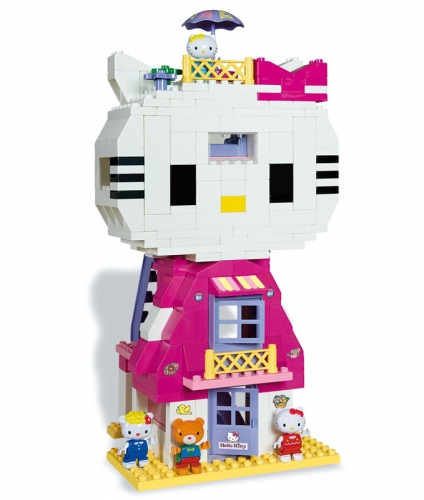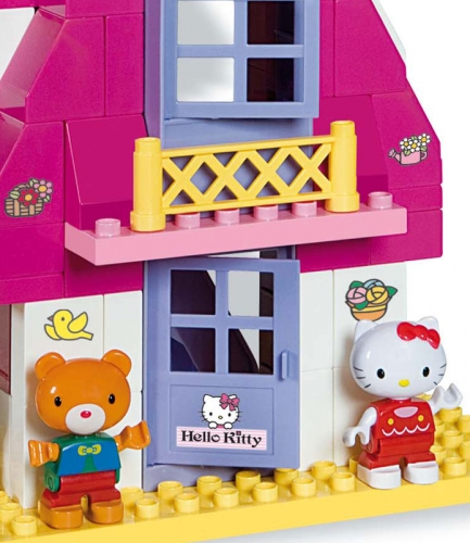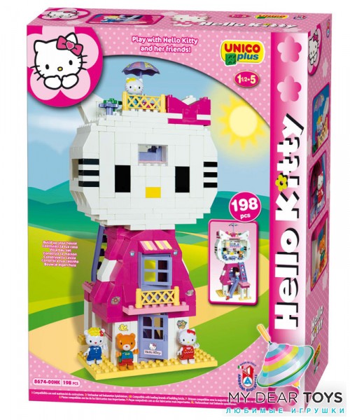 Эксклюзивный конструктор из серии "Hello Kitty" торговой марки UNICO PLUS известной итальянской компании ANDRONI GIOCATTOLI. Большой дом в виде кошки Hello Kitty! Оригинальный и замечательный подарок для девочки, которой нравится Hello Kitty! В игровом наборе конструктора: 4 фигурки - Hello Kitty и ее друзья, большой, на 4 уровня дом Hello Kitty. С тыльной стороны дома - комната на втором уровне (спальня), комната на третьем уровне и на крыше - уголок для отдыха. У фигурок подвижные ноги (обе сразу, относительно туловища), руки. Детали конструктора яркие и красочные. Игра с конструктором развивает у ребенка фантазию и воображение, мелкую моторику, умение комбинировать, складывать из частей целое. **Размер деталей:** самая большая - 25 * 12,5 см/ самая маленькая - 1,5 * 3 см