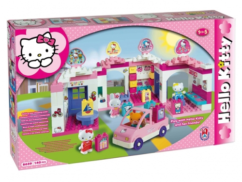 **Конструктор Androni "Hello Kitty" - "Торговый центр" - 144 детали.** Яркие цвета, качество и долговечность очень нравятся, как детям, так и родителям. В набор входит четыре фигурки, детали для строительства здания и обстановки, шкафчики, стол, стул, полочки, а также автомобиль. **Размер:** 55,5*33*10 см **Возраст:** 1,5 - 5 лет