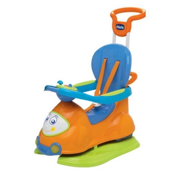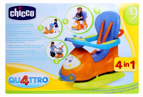 **Автомобиль - качалка Quattro (4 в 1)** может быть использован и как качалка, и как машина, которую взрослый с помощью удобной ручки может везти в любом направлении. Ребенок и сам может сзади толкать машину или ехать на ней, отталкиваясь ногами, кроме того, музыкальная панель, установленная на руле – великолепное развлечение для малыша! Возраст: 12+