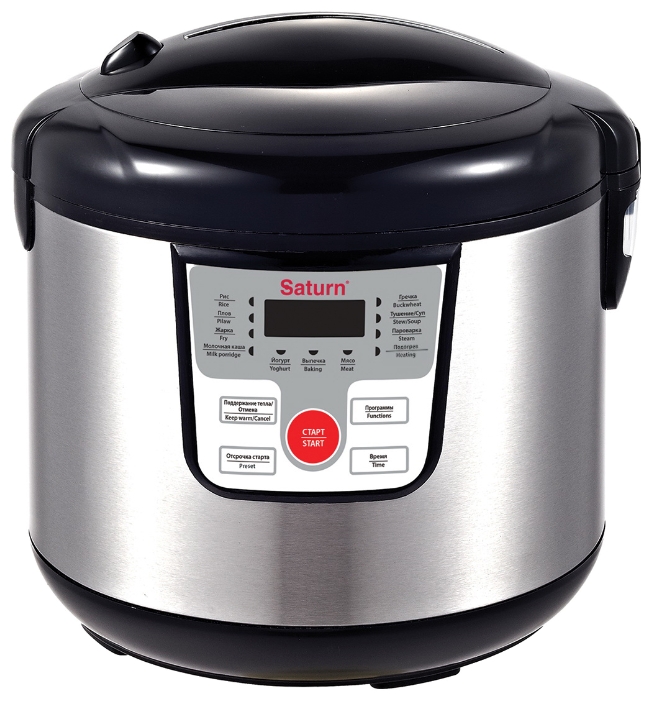 Multicooker Saturn ST-MC9193 Мощность 900 Вт Объем чаши 5 л Количество программ 10 Дисплей есть Дополнительные характеристики Пароварка есть Функция скороварки нет Функция йогурт есть Голосовой гид нет Ручной режим есть Управление электронное Внутреннее покрытие кастрюли двойное керамическое Таймер отсрочки приготовления 24 ч Программы приготовления рис, плов, жарка, молочная каша, йогурт, выпечка, мясо, гречка, тушение/суп, приготовление на пару Особенности Звуковой сигнал завершения приготовления Подогрев Режим поддержания тепла Аксессуары мерный стакан, ложка для риса, ложка для супа, насадка для приготовления на пару Габариты, вес, цвет Цвет серебристый/черный
