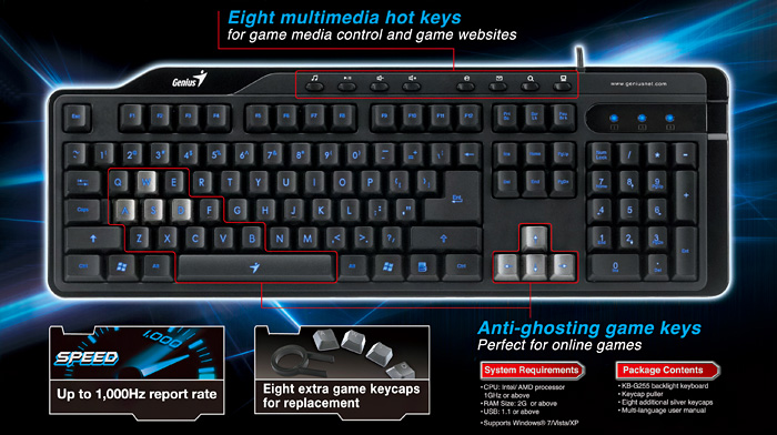 Клавиатура Genius KB-G255 Black USB Комплектация клавиатура Назначение настольный компьютер Интерфейс подключения USB Цвет черный Конструкция классическая Тип мембранная Цифровой блок есть Количество клавиш 112 Количество дополнительных клавиш 8 Размеры (ШxВxГ) 466x29x158 мм Вес 695 г Особенности 8 дополнительных клавиш (4 для медиа, 4 для Интернет), 8 сменных серебристых клавиш с подсветкой