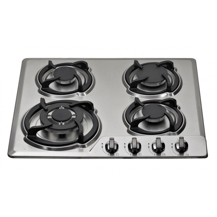 Поверхность из нержавеющей стали 4 газовые конфорки Чугунные решетки Электроподжиг Газ-контроль конфорок Размеры:580x500x80мм.