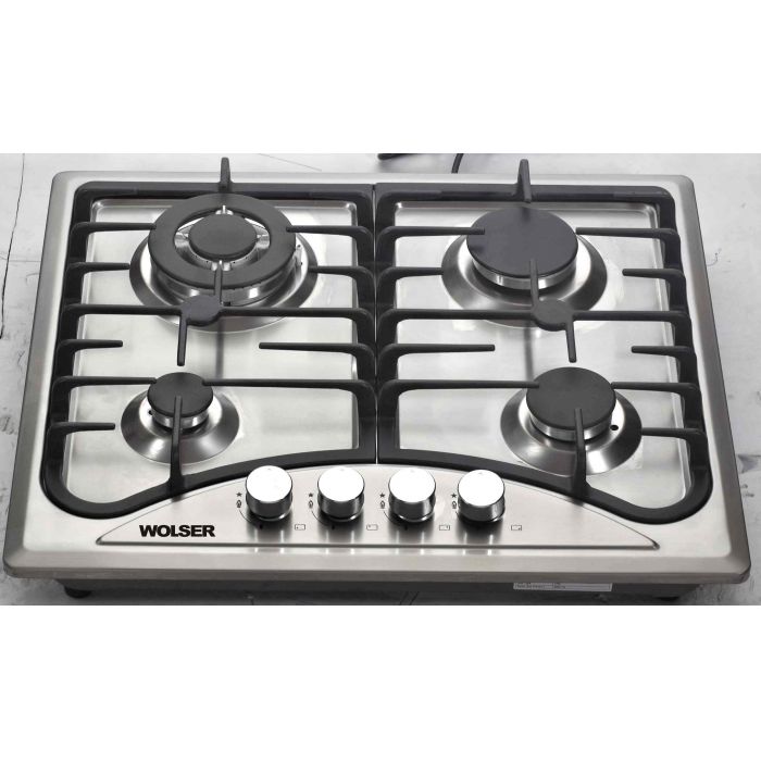Варочная панель Wolser WL-6405 IX Поверхность из нержавеющей стали 4 газовые конфорки Чугунные решетки Электроподжиг Газ-контроль конфорок Размеры:580x500x80ммВарочная панель Wolser WL-6405 IX