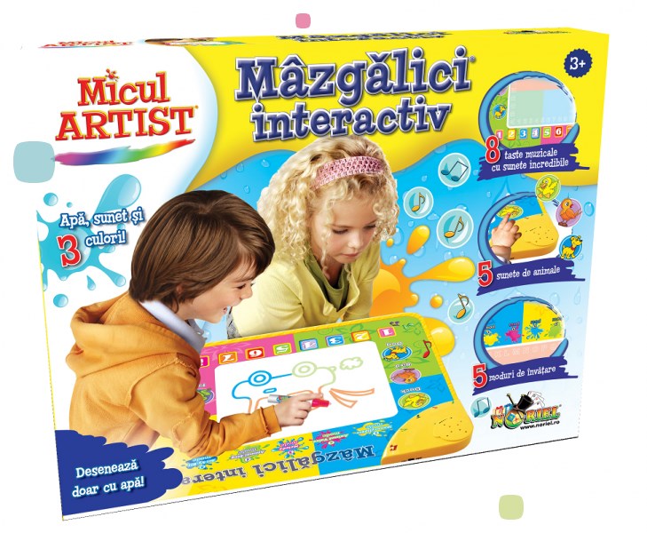 Mazgalici Interactiv Mazgalici Interactiv Apa, sunet si culoare... Lumea micului artist! O jucarie inovatoare, distractiva si sigura! Picteaza fara sa lasi urme! Ai 8 taste muzicale cu sunete incredibile, 5 sunete de animale si 5 moduri de invatare cu Micul Artist - Mazgalici interactiv! Utilizare: 1. Scoate capacul 2. Umple creionul cu apa 3. Picteaza multicolor Desenul dispare fara urma in numai cateva minute, iar tu poti incepe un desen nou! Dimensiuni covoras: 50 x 50 cm Jucarie recomandata copiilor cu varsta peste 3 ani.