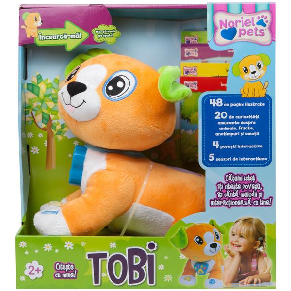 Noriel Pets Toby Jucarie interactiva Noriel Pets Tobi Tobi este catelusul istet, care iti citeste povesti, iti canta si interactioneaza cu tine! Citeste cu el! Canta cu el! Stie cantece de leagan si poezii pentru somn! Tobi este o jucarie de plus interactiva, prevazuta cu o zgarda pe care sunt dispuse butoane de selectare a modului de joc si a povestilor. Tobi are cinci senzori pe corp, prin atingerea carora copiii pot interactiona cu el: pe cap, pe spate, pe labuta dreapta, pe labuta stanga sil pe obraz. Setul contine: 1 catelus de plus multifunctional 4 carti cu povesti si ilustratii Functiile Tobi: 48 de pagini ilustrate 20 de curiozitati amuzante despre animale, fructe, anotimpuri si emotii 4 povesti interactive 5 senzori de interactiune care se activeaza prin apasare si mangaiere Catelusul Tobi spune patru povesti educative cu patru teme diferite: numere, culori, emotii si anotimpuri. Asculta-l pe Tobi, raspunde la intrebarile lui si citeste carticelele minunat ilustrate (incluse in set): 1. O zi la tara - invata cifrele si descopera animalele de la ferma, ce mananca ele si cum este viata la tara! 2. Fructe si legume - invata despre fructe si legume, dar mai ales despre culori, caci Tobi face un curcubeu surpriza! 3. Emotii - afla ce sunt emotiile si cum ne afecteaza ele, descoperind o zi din viata lui Tobi! 4. Casuta din copac - Tobi si-a construit o casuta in copac si, privind de la fereastra ei, descopera anotimpurile! Tobi are 2 moduri de functionare: modul "la culcare" Pentru a selecta acest mod, mutati butonul de pe zgarda lui Tobi in dreptul celui de somn. Jucaria va rosti o fraza de introducere. Apoi apasati pe oricare dintre cele patru butoane numerotate de pe zgarda sau atingeti oricare dintre cei cinci senzori de pe corpul catelului. In functie de butonul apasat sau de senzorul atins, Tobi va rosti o fraza, va spune o poezie, va canta un cantec de leagan sau va emite un sunet. modul "invatare" Pentru a selecta acest mod, mutati butonul de pe zgarda lui Tobi in dreptul cartii. Tobi va va indemna sa selectati o poveste, apasand pe unul dintre butoanele de pe zgarda. Fiecare poveste pe care o spune Tobi este inclusa intr-o carticica ilustrata. Dupa fiecare etapa din poveste, Tobi pune o intrebare sau va atentioneaza ca are de impartasit o informatie interesanta. Pentru a afla raspunsul la intrebare/informatia, trebuie sa atingeti senzorul la care face referire Tobi. Daca ati atins corect senzorul, Tobi raspunde. Dupa 3 minute de inactivitate, Tobi se va opri. Functiile pot fi reactivate prin activarea acestora. Acest produs functioneaza cu 3 baterii tip AA / LR6. Bateriile incluse sunt destinate exclusiv demonstratiei in magazin. Culorile si detaliile de design pot varia. Material: plus Varsta recomandata: 2 ani +
