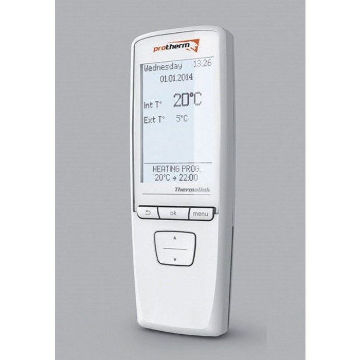 Радиоуправляемый комнатный термостат PROTHERM THERMOLINK LUX Программируемый комнатный термостат Thermolink LUX служит для управления отопительной или охладительной системой в зависимости от комнатной температуры, от установленной отопительной или охладительной программы и в том случае, если подсоединен наружный датчик, в зависимости от наружной температуры. Комнатный термостат в то же время управляет подготовкой горячей воды в зависимости от установленной программы. Комплект комнатного регулятора Thermolink LUX состоит из комнатного термостата и сборника-приемника, который можно установить непосредственно в корпусе котла. Оснащение и свойства регулятора TERMOLINK LUX: Регулятор с ЖК-дисплеем Безкабельная коомуникация Вид программы: 1 неделя + 1 суточный Принцип работы: плавное регулирование Снижение расходов на отопление Тип: eBus Плавная регулировка котла (eBus) Программа на 24 часа или на 7 дней Диапазон температур в помещении: 5 - 30?C Количество программов температурных изменений в помещении в день: 7 Возможность настройки температуры горячей воды Диапазон температур горячей воды: 35 - 65?C Возможность настройки эквитермической кривой Изображение актуального времени и дня недели Режим отпуска: макс. 99 дней Защита системы от замерзания питание: 4x 1,5 В батареи типа АА Размеры ВхШхГ 175х62х31мм