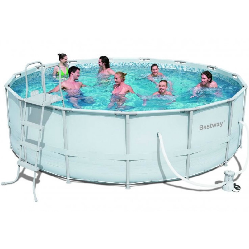 Каркасный бассейн 427х122 см Характеристики: Размер: 427 х 122 см. Каркас: металлические стойки. Стенки бассейна: трехслойные, два слоя винила и внешний слой из полиэстра. Объем: 14600 л. Фильтр: есть. Тип фильтрующего элемента: кварцевый песок № 20 (приобретается отдельно). Производительность насоса: 4000 л/час. Сливной клапан: есть. Цвет: светло-серый. Размер упаковки: 78 х 47 х 115 см. Объем упаковки: 0.42 м3. Вес: 78 кг.