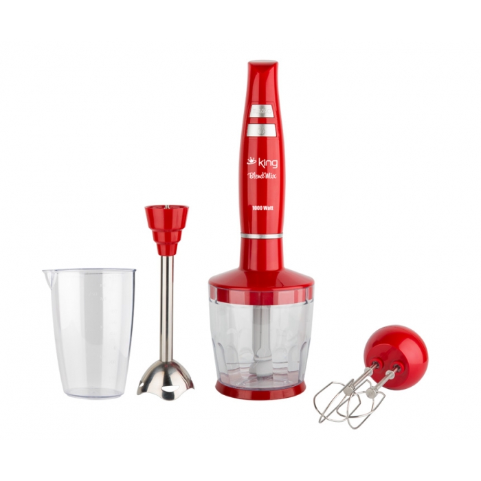 KING P 962 King P 962 погружной блендер с мощностью 1000Вт и механическим управлением. Корпус и мерный стакан сделаны из высококачественного пластика. Мощность: 1000 Вт Объем чаши: 0.8 л. Количество скоростей: 2 Функциональные возможности Большой измельчитель: есть Венчик для взбивания: есть Мерный стаканчик: есть Материал корпуса: пластик Материал погружной части: нержавеющая сталь Цвет: красный
