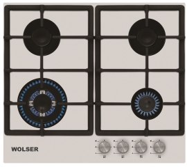 Варочная панель Wolser WL-TR6400GTW Белое каленное стекло (8 мм) Чугунные решетки Итальянские горелки Tecna Турбо-горелка Спец. чугунная подставка для чугунка Газ-контроль Электроподжиг Габариты: 590мм*520мм*90ммВарочная панель Wolser WL-TR6400GTW