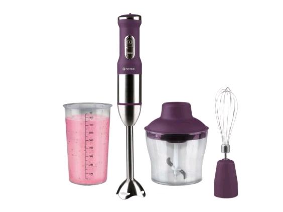 VITEK VT-3415 Burgundy Венчик для взбивания + Длина сетевого шнура 120 Емкость измельчителя 500 мл Емкость мерного стакана 600 мл Измельчитель + Количество скоростей 15 Колка льда + Материал корпуса нержавеющая сталь/пластик Материал погружной части нержавеющая сталь Мерный стакан + Мощность 900 вт Нескользящие ножки + Плавная регулировка скорости + Тип блендер погружной Турборежим + Управление механическое