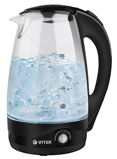 Электрочайник VITEK VT-7034 TR объем 1.8 л мощность 2200 Вт индикация включения закрытая спираль установка на подставку в любом положении корпус из пластика и стекла подсветка корпуса