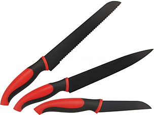 Набор ножей BOHMANN BH - 5209 Набор ножей 3 предмета Нож для чистки овощей 3,5" (8,9см.) Толщина лезвия 1,8мм. Нож для хлеба 8"(20см.) Толщина лезвия 2,0мм. Нож для мяса 8"(20см.) Толщина лезвия 2,0мм. Стальные лезвия. Non-stick покрытие. Эргономичная пластиковая ручка.