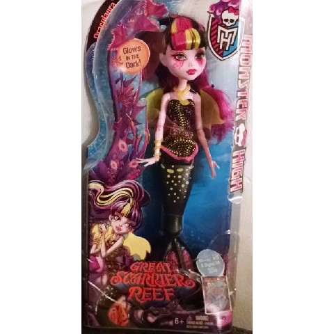 Descriere: Papusa Monster High seria "Scarrier Reef" Mattel Alatura-te si tu in vartejul aventurilor imreuna cu elevii scolii Monster High! In noul desen animat "Scarrier Reef" fetele s-au transformat in monstri-peste, fiecare dupa placul sau. Draculora in vampir-calmar iar Clawdeen Wolf in somn de prada. Aripioarele fetelor monstri-peste lumineaza in intuneric, usor se tin in coada fosforescenta si sunt machiate tematic in culori deosebite. Dimensiuni: 26 cm Varsta recomandata: 6 ani +