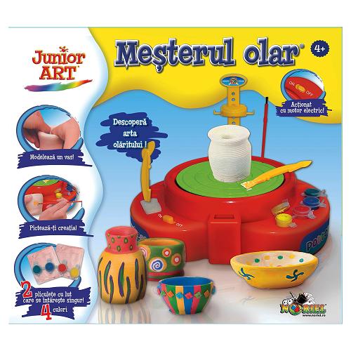 Mesterul Olar dezvolta abilita?ile practice ale copiilor, contrubuie la educa?ia estetica ?i dezvolta sim?ul artistic.Jocul con?ine roata olarului, vopsea 4 culori, unelte pentru sculptat ?i decorNORIEL MESTERUL OLAR