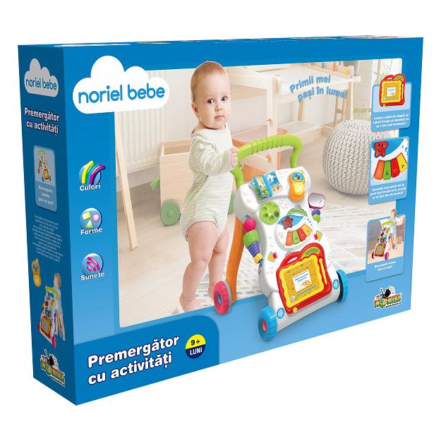 Jucarie bebelusi Noriel Bebe - Premergator cu activitati Primii mei pasi in lume! Lumea e plina de imagini si culori! Invata sa desenezi ca sa o faci mai frumoasa! Sunetele sunt peste tot in jurul tau! Invata sa le asculti si sa faci din ele muzica! Descopera lumea pas cu pas! Premergatorul este prietenul care il sprijina pe micut in primii sai pasi si il invata sa mearga! Setul include jucarii detasabile cu diverse activitati educative (tablita de desen, telefon mobil, pianina, carticica cu imagini, etc). Toate acestea incurajeaza dezvoltarea copilului pe toate planurile . premergatorul poate fi folosit in doua moduri: ca sprijin pentru mers sau ca masuta cu activitati (suport pentru jucarii!) Nota: Jucaria functioneaza cu 2 baterii tip AA de 1.5V (nu sunt incluse) Recomandare varsta: 9 luni+