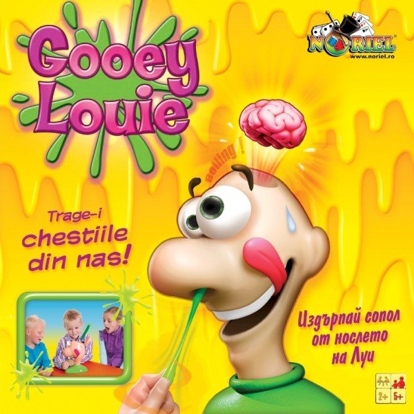 Joc NORIEL Gooey Louie Jocul presupune ca participantii la joc sa traga pe rand benzile de cauciuc din nasul personajului principal, Louie. Acestea se numesc "gooey". La un moment dat, unul dintre jucatori va avea sansa sa traga o "gooey" care-i va face creierul personajului sa explodeze, la propriu, si astfel va iesi din joc. Se poate reincarca si se poate juca pana la ultimul jucator, care va fi castigatorul! Jocul Gooey Louie se poate juca in maximum 7 jucatori. Produsul este recomandat copiilor cu varsta peste 3 ani.