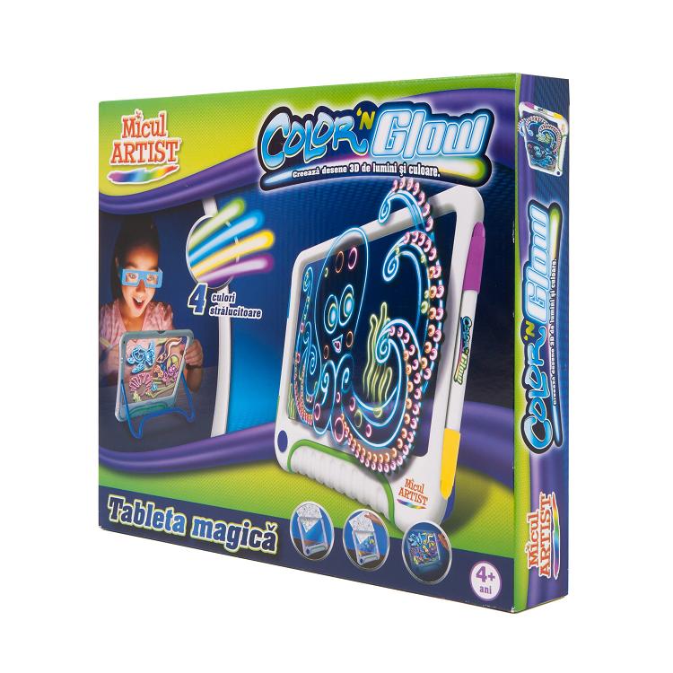 Micul Artist - Tablita Magica Creeaza imagini 3D stralucitoare care prind viata! Cum ar fi sa lasi imaginatia sa zburde, sa desenezi si sa iti poti vedea desenul 3D? Acum, cu Noriel, visul devine realitate. Fiecare culoare si forma din desenul tau vor putea fi vazute in amanunt, ca si cand ai putea sa le atingi. Fii copil talentat in 3D, doar cu Micul Artist - Tablita Magica. Ideal pentru micii artisti din fiecare familie. Pune un sablon in tabla de desen si copiaza imaginea pe tabla cu markerele speciale pentru a crea un desen luminos si uluitor pe care il poti vedea in 3D cu ochelarii inclusi! Tabla se sterge usor, ca sa poti face un desen nou imediat! Setul contine: 1 x Tabla desen 1 x Ochelari 3D 4 x Sabloane 2 x Markere speciale cu tus stralucitor, cu cate 2 capete (4 culori in total) Recomandare varsta: 4 ani+ Avertisment Podusul se recomanda copiilor cu varsta peste 4 ani Instructiuni in limba romana incluse. Produsul functioneaza cu 3 baterii tip LR03 (AAA) de 1.5V (nu sunt incluse). Bateriile trebuie sa fie instalate si inlocuite numai de catre adulti, conform instructiunilor. Nerecomandat copiilor cu varsta sub 3 ani. Contine piese mici care pot fi inghitite Indepartati toate elementele de ambalaj inainte de a oferi jucaria copilului. Nu lasati pungi din plastic la indemana copiilor - pericol de asfixiere.