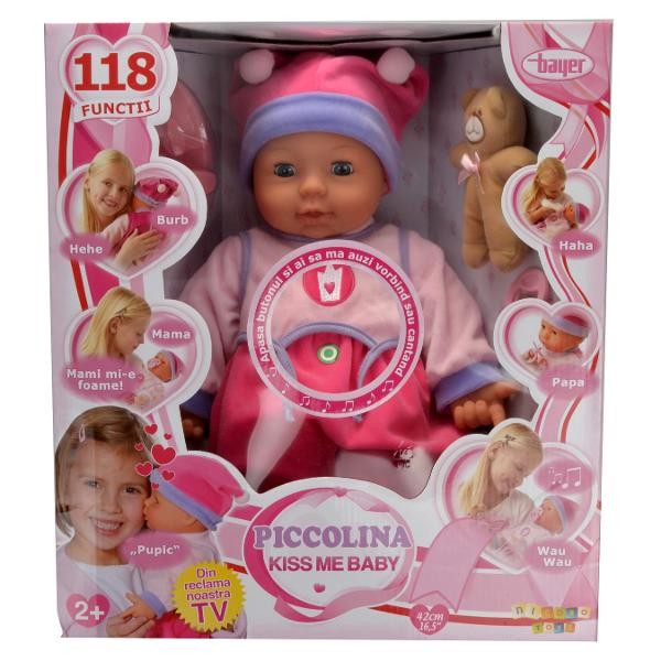 NICORO PICOLLINA - KISS ME BABY Papusa bebe interactiva Picollina - Kiss Me Baby cu 118 functii Caracteristici: - 42 centimetri - 100 de propozitii in limba romana - 18 sunete de bebe (mama, papa, ras, chicotit, plans, tusit, gangurit etc.) Senzor de miscare: cand este aruncata in sus, papusa va rosti aleator diverse sunete: bebe, ras, plans, chicotit Senzor tactil de garait amplasat pe spate Functie de pupat - atunci cand sunt atinsi obrajii sau gura bebelusului, se va auzi un sunet de pupat Cand este pozitionata orizontal, papusa Picollina Kiss Me Baby inchide ochii.