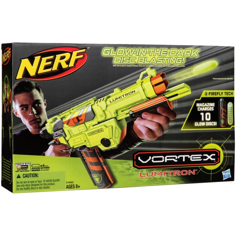 HASBRO Nerf VORTEX LUMITRON Бластер Nerf Vortex Lumitron, стреляющий дисками, изготовленными по новой технологии Firefly Tech - диски светятся в темноте! Теперь играть в сражения можно даже в темноте. Боеприпас бластера Nerf Vortex Lumitron включает 10 дисков, перезарядка между выстрелами осуществляется подствольной рукояткой. В комплекте: Бластер Нерф Vortex Lumitron с 10 дисками и инструкция Для работы необходимы 4 батарейки типа АА (в комплект не входят)