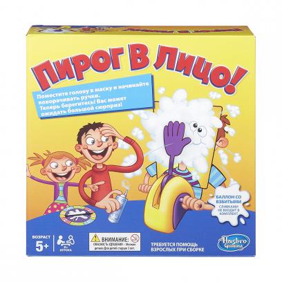 Игра "Pie Face! (Пай Фэйс) Пирог в лицо" Hasbro (Хасбро) Захватывающая игра "Pie Face! Пирог в лицо" от компании Hasbro обязательно развеселит детскую компанию. Из входящих в комплект деталей собирается катапульта с "рукой" для запуска и маской с овальным отверстием для лица. На ладонь "руки" можно намазать взбитые сливки или положить мягкую губку. Игроки по очереди крутят рулетку с цифрами, так определяется количество вращений рычага на катапульте. Участник помещает лицо в рамку и крутит механизм в ожидании шлепка. Интерес в том, что пружина может сработать в любой момент. Если этого не происходит, выпавшее число записывается на счет счастливчика. Незамысловатая, но очень забавная, игра развеселит любую компанию. Все детали выполнены из качественного пластика с нетоксичными красителями. Дополнительно: Возраст: от 5 лет. Материалы: пластмасса. Количество игроков: от 2. Размер упаковки: 27x27x8 см. Вес: 322 г. В комплекте:игровая катапульта (рука для запуска, 2 ручки для вращения механизма, фиксатор подбородка, маска с отверстием для лица); рулетка; губка.