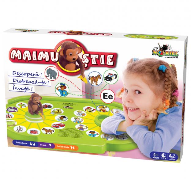 Joc NORIEL Maimu stie Maimu e maimutica teribil de isteata care le stie pe toate! Nu poti s-o pacalesti nu nimic! Continut: - 1 figurina maimuta - 5 planse cu ilustratii pe ambele fete - 1 suport Maimu Stie este un joc spectaculos care te invata sa faci legaturi intre diferite concept si sa recunosti obiecte, culori si forme. Iata cum: • Pune plansa in suport. • Pune maimutica in cercul din stanga plansei. • Roteste maimutica pe loc, pana cand banana din mana ei este indreptata spre imaginea pe care vrei sa o alegi. • Incearca sa ghicesti ce imagine din cercul din dreapta corespunde imaginii pe care ai ales-o in cercul din stanga. • Vrei sa vezi daca ai avut dreptate? Pune maimutica in centrul cercului din dreapta si da-i drumul. • Maimutica cea isteata se va roti singura pana cand banana din mana ei va indica imaginea corecta!