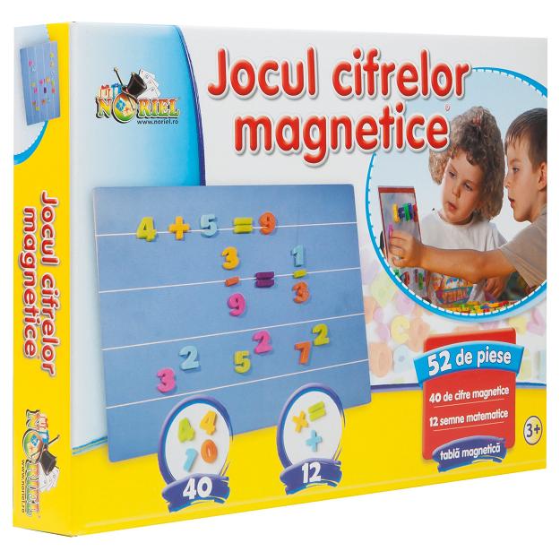 Joc NORIEL Jocul cifrelor magnetice Contine 52 piese: 40 cifre magnetice 12 semne matematice Tabla magnetica Recomandare varsta: 3 ani+