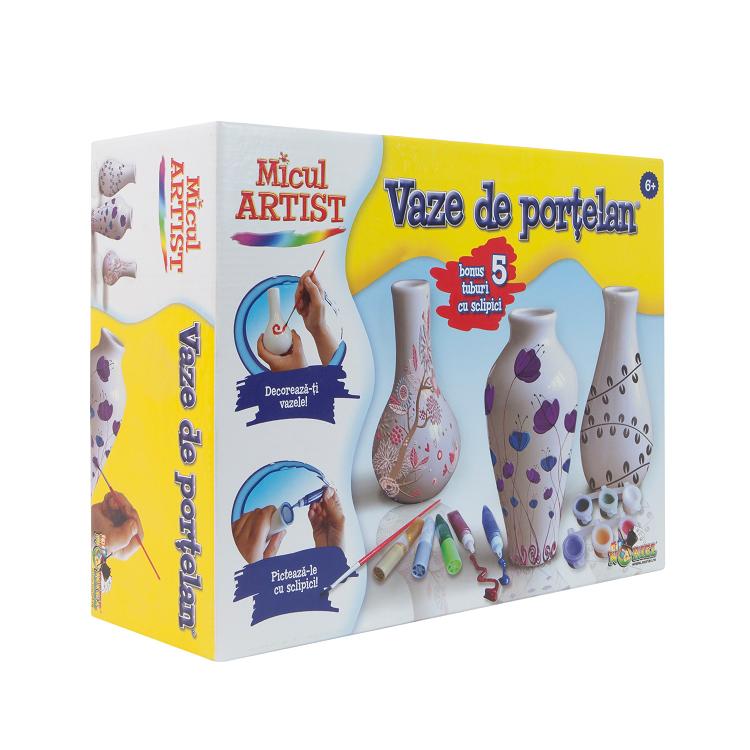 Micul Artist - Vaze de portelan Creeaza lumi de culori! Creeaza vaze demne de un artist! Acest set iti ofera tot ce iti trebuie ca sa pictezi si sa decorezi trei vaze cu modele si culori stralucitoare. Pentru un plus de eleganta foloseste sclipici! Setul contine: 3 vaze de portelan 6 culori Pensula 5 tuburi cu sclipici Atentie! Podusul nu se recomanda copiilor cu varsta sub 6 ani Materialele destinate activitatilor artistice, precum vopseaua, plastilina, lacul etc. pot pata suprafetele cu care iau contact (mobila, covoare, textile etc). Protejati imbracamintea si suprafata de joaca in timpul folosirii produsului, acoperind-o cu o folie din plastic. A nu se ingera. Evitati contactul materialului cu ochii sau gura.