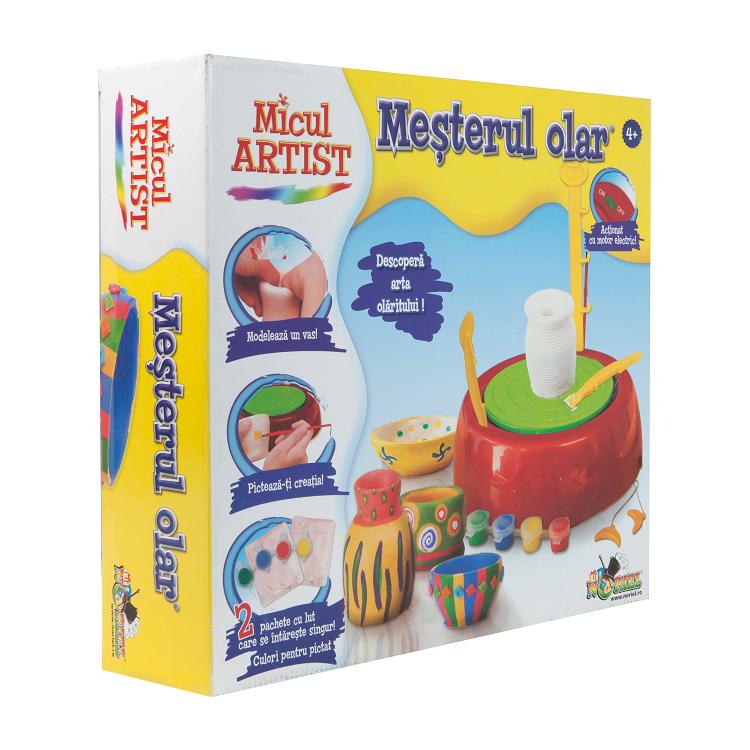 Micul Artist - Mesterul Olar Asemenea mesterilor olari, creeaza, modeleaza si decoreaza vase folosind lut care se usuca! Descopera arta olaritului! Modeleaza un vas, sculpteaza-l, picteaza-ti creatia si asteapta sa se intareasca. Gata, ai un vas doar al tau, care sigur va atrage privirile tuturor! Caracteristici: roata olarului este actionata prin motor electric functioneaza cu 2 baterii tip D dezvolta dexteritatea, indemanarea, creativitatea si simtul artistic Setul contine: Roata olarului Suport pentru decorare si sculptat 6 x Vopsele pentru pictat 2 x Unelte pentru sculptat 2 x Pensule Fir pentru taiat Platan rotativ pentru olarit 2 x 500 grame lut Paleta Instructiuni Recomandare varsta: 4 ani+ Avertisment: Nerecomandat copiilor cu varsta sub 4 ani. Contine piese mici care pot fi inghitite. Observatii: Produsul functioneaza cu 2 x Baterii tip D (nu sunt incluse in set). Culorile si detaliile de design pot varia. Indepartati toate elementele de ambalaj inainte de a oferi jucaria copilului. Nu lasati pungi din plastic la indemana copiilor mici - pericol de asfixiere. Va rugam sa pastrati ambalajul si toate informatiile in legatura cu acest produs pentru referinte ulterioare. Atentie! Materialele destinate activitatilor artistice, precum vopseaua, plastilina, lacul etc. pot pata suprafetele cu care iau contact (mobila, covoare, textile etc). Protejati imbracamintea si suprafata de joaca in timpul folosirii produsului, acoperind-o cu o folie din plastic. Pentru a indeparta petele de vopsea, stergeti suprafata patata cu o laveta umeda. Pentru a inlatura urmele de plastilina de pe covor, folositi o perie. A nu se ingera. Evitati contactul materialului cu ochii sau gura.