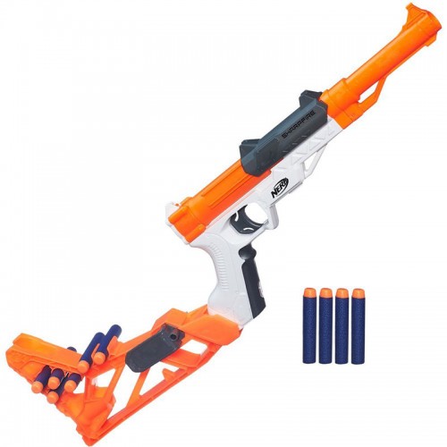 HASBRO NERF NSTRIKE SHARPFIRE Нерф Шарп Файер – это универсальный бластер с отличными стрелковыми характеристиками. По своей сути эта модель представляет собой однозарядный пистолет. Но благодаря дополнительным аксессуарам он с легкостью превращается в подобие винтовки. Преимуществ Nerf Elite Sharpfire очень много. Начнем с того, что в комплект входят съемный ствол и приклад. Каждый из этих элементов позволяет в значительной степени улучшить характеристики Шарп Файер. Приклад оборудован 6 ячейками для хранения дополнительных патронов. Минусом такого расположения является то, что боеприпасы могут выпадать при прицеливании. Также в Nerf Elite Sharpfire есть специальная клипса, которая дает возможность вешать пистолет на поясной ремень. Ствол оборудован мушкой, позволяющей значительно улучшить точность стрельбы. Nerf Sharpfire выстреливает по 1 пуле. Для зарядки оружия стрелку необходимо отодвинуть затвор, расположенный в верхней части корпуса и вставить патрон в специальный паз. Бластер обладает хорошими показателями точности и может выступать в качестве снайперского оружия. Минусом Нерф Шарп Файер является тот фактор, что на корпусе не предусмотрено тактических пластин для модернизации. В комплект входит: Бластер Нерф Шарп Файер. 10 патронов. Съемный приклад и ствол. Инструкция.