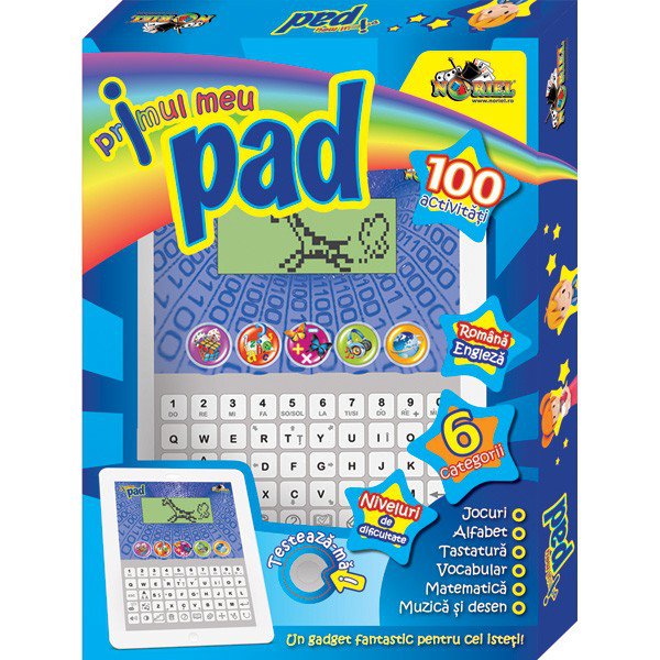 Primul Meu Pad Alb Negru - Tableta Singura Tableta cu 100 de activitati din Romania! Primul meu Pad – o jucarie bilingva isteata care imbina joaca si invatatul, totul intr-un dispozitiv distractiv si usor de utilizat. Cele 100 de activitati care vor incanta orice copil dornic sa invete sunt disponibile in limbile romana si engleza; multe dintre ele prezinta mai multe niveluri de dificultate. Activitatile sunt impartite in 6 categorii: Jocuri, Alfabet, Tastatura, Vocabular, Matematica, Muzica si desen. Un gadget fantastic pentru cei isteti! Jucarie recomandata copiilor cu varsta peste 3 ani