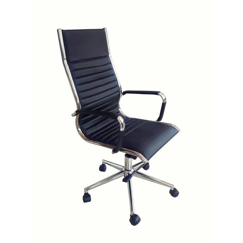 AMF ENZO black Ультрамодное офисное кресло с элегантным хромированным каркасом и крестовиной. Съемные кожаные чехлы на подлокотниках. Краткие характеристики AMF Enzo Chrome Black Тип : кресло для руководителя Основание : крестовина с роликами Механизм качания : есть Подлокотники : есть Регулировка высоты : есть Материал обивки : искусственная кожа Цвет : чёрный Производитель : AMF
