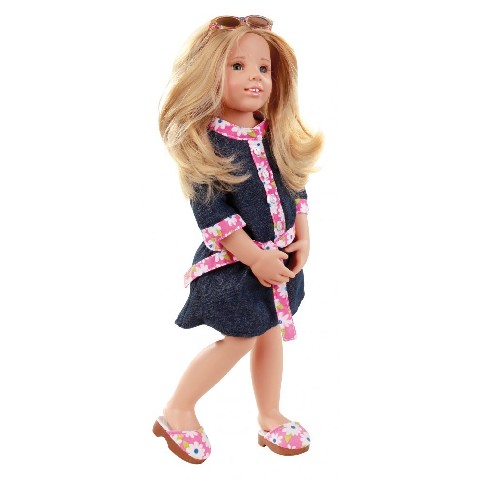 GOTZ ANNA, 50cm,blond Este papu?a cu parul lung blond ?i ochi albastri, mobili. Are un costum simplu din 2 piese, elegant din denim, cu bordura roz, asortata cu pantofii. Parul este frumos pieptanat, la moda. Are ochelari de soare pe cre?tet. Parul papu?ii este cusut ?i este dintr-un material de cea mai оnalta calitate, foarte rezistent ?i cu aspect. Оn plus, este lavabil ?i poate fi aranjat cu bigudiuri. Posibilita?ile sunt limitate doar de imagina?ia dumneavoastra. Anna face parte din familia GÖTZ, a caror fe?e sunt realizate de designeri celebri.