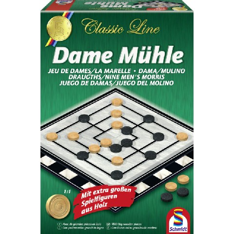DRAUGHTS / NINE MEN'S MORRIS Hастольная игра Шашки / Девять человек Моррис (Мельница) В игре три этапа: 1. Доска пуста. Игроки по очереди выставляют фишки по одной на поле – на перекрестья и в углы, стремясь выстроить три фишки в ряд – «мельницу». Если это удалось, игрок может «смолоть» любую фишку противника, убрать её с доски. Срубленная фишка больше в игру не возвращается. 2. Фишки расставлены и начинают двигаться. Ходить можно только по линиям на соседний перекрёсток (в некоторых вариантах - ещё и прыгать друг через друга, но только не с линии на линию). Цель прежняя – выстроить три фишки в ряд, что позволит «смолоть» фишку противника. 3. Когда у игрока остаются всего три фишки, он получает право переносить фишку на любое перекрестье, независимо от начерченных линий. Игра для: 2 игроков Приблизительная продолжительность: 30 минут Рекомендуемый возраст: 7 лет +